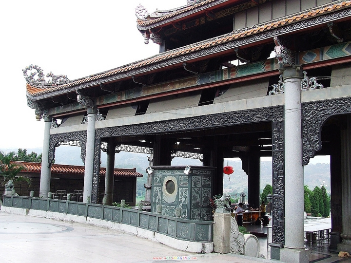 现在矗立在我们面前的是雄伟壮观,气势非凡的“南疆一峰”牌坊。“南疆一峰”四个雄壮观、浑厚有力的闪闪大字,是由全国政协副主席叶选平题写。牌坊位于风景区主轴线前端,亭长18米,宽48米,高15.68米,由168块大花岗石砌成,为粤东地区最大的石结构大牌坊。踏上108级台阶,经过五彩缤纷的奇花异卉以及绿茵如毯的芳草地、玲珑别致的喷水池、养生池、翔龙津,呈现在我们面前的是“大峰祖师亭”。