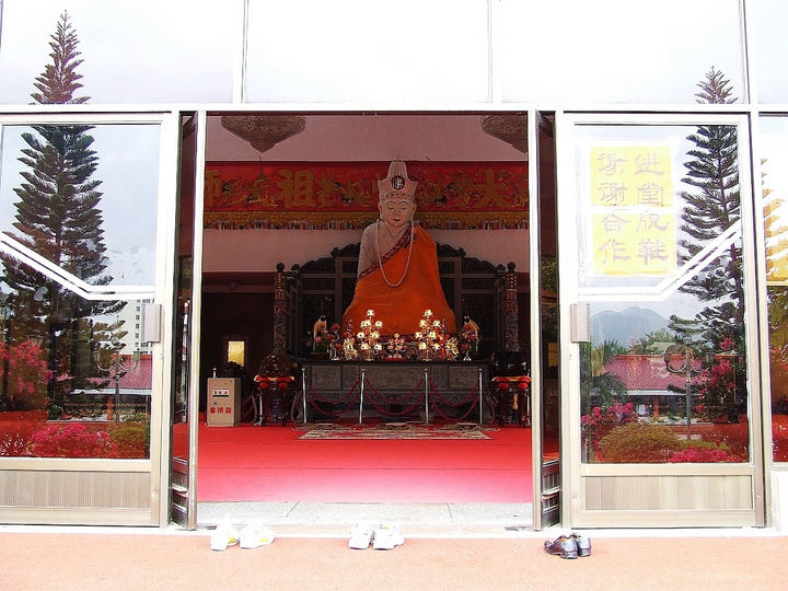 大峰祖师亭,长22米,宽16米,由16根巨石柱支撑而成。亭阁建筑风格独特,楹檐雕刻精细,花虫走兽形象逼真,呼之欲出,亭顶琉瓦飞彩,龙凤朝阳,泻红荡绿,格外醒目。亭匾额“大峰祖师亭”,由泰国华侨报德善堂董事长郑午楼博士敬题。玻璃柜内是一尊大峰祖师汉白玉坐像,高28米,宽165米,重3.5吨,是从缅甸运来的。