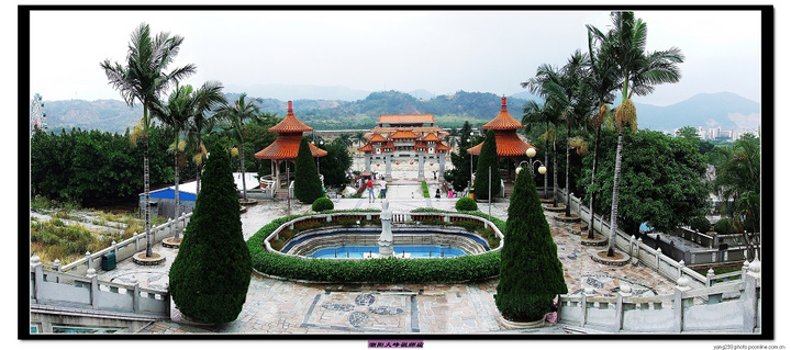 在主轴线前面,有一座巍峨的牌坊亭,亭名“南疆一峰”为时任全国政协副主席的叶选平先生所题。亭为三门四柱,高度为15.68米,由168块花岗岩石砌成,顶系棕色琉璃瓦,不但位置显要,而且雄伟壮观、古色古香,十分引人注目。亭柱主联镌刻着: